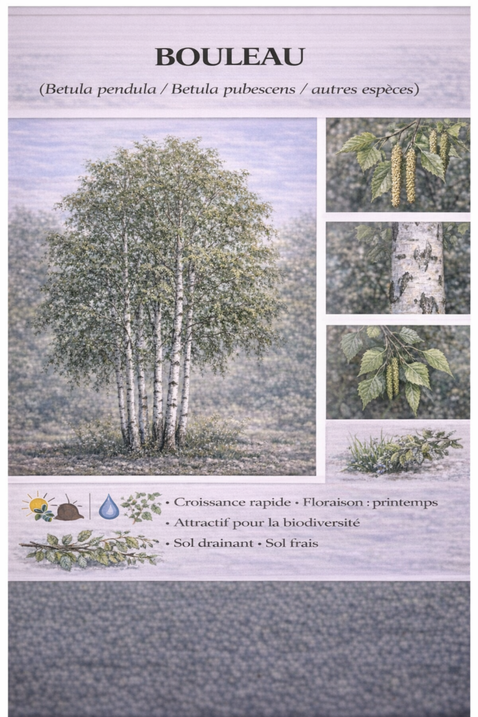 - Noms scientifiques : Betula pendula, Betula pubescens, Betula nigra, Betula papyrifera