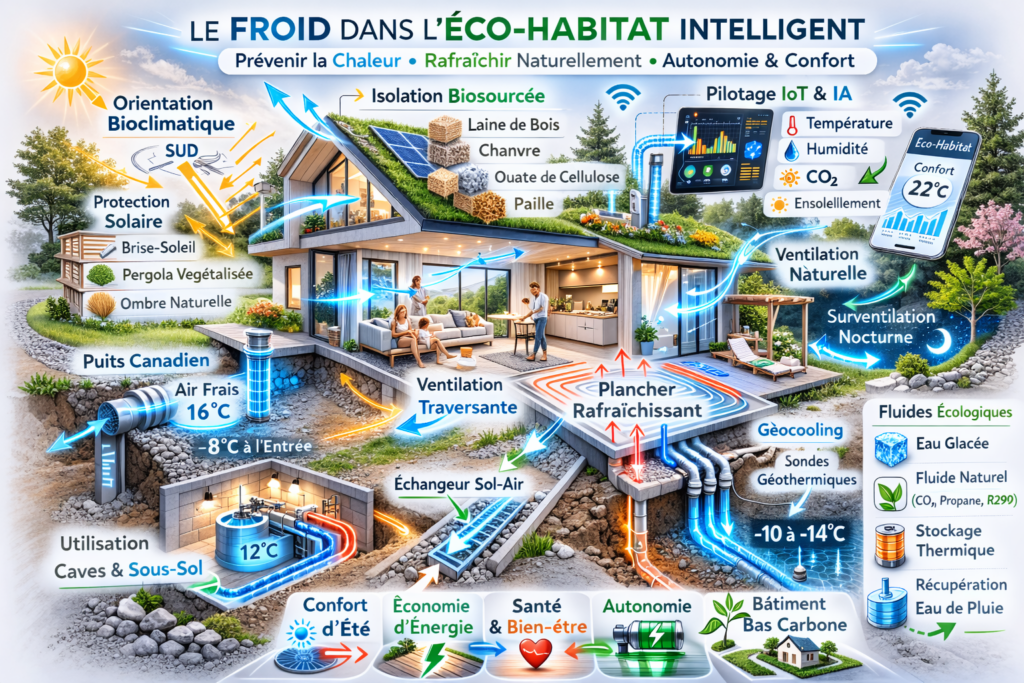 Mots-clés SEO stratégiques : climatisation écologique, rafraîchissement passif, puits canadien, géocooling, isolation thermique biosourcée, inertie thermique, ventilation naturelle, orientation bioclimatique, fluides écologiques, ingénierie énergétique, IA habitat, autonomie énergétique, éco-construction, confort d’été, bâtiment bas carbone.