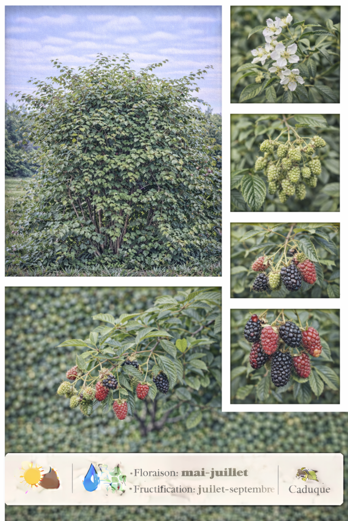 - Variétés cultivées : Thornless Evergreen, Black Satin, Chester, Loch Ness, Navaho, Triple Crown…