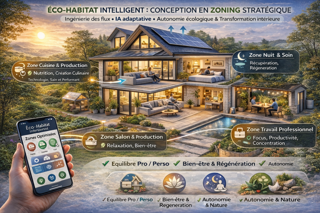 Éco-habitat intelligent, zoning habitat, conception maison écologique, séparation pro perso domicile, autonomie alimentaire maison, ingénierie habitat durable, IA maison connectée, IoT habitat écologique, développement personnel habitat, épigénétique environnement, potager autonome, verger écologique, maison basse consommation, éco-construction intelligente.