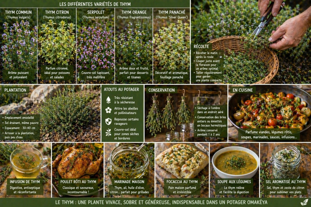Culture du thym (thym commun, citron, serpolet…), plantation en sol drainé, couvre-sol sec, récolte, conservation et cuisine — guide expert complet Omakëya pour un potager autonome, économe en eau et hautement productif.