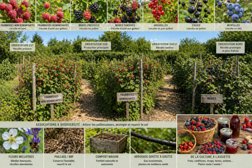 Créer une zone de petits fruits productive et autonome : framboisiers, mûriers, groseilliers, variétés remontantes et non remontantes, étalement des récoltes, multiplication facile, orientation, design Omakëya — guide expert complet.